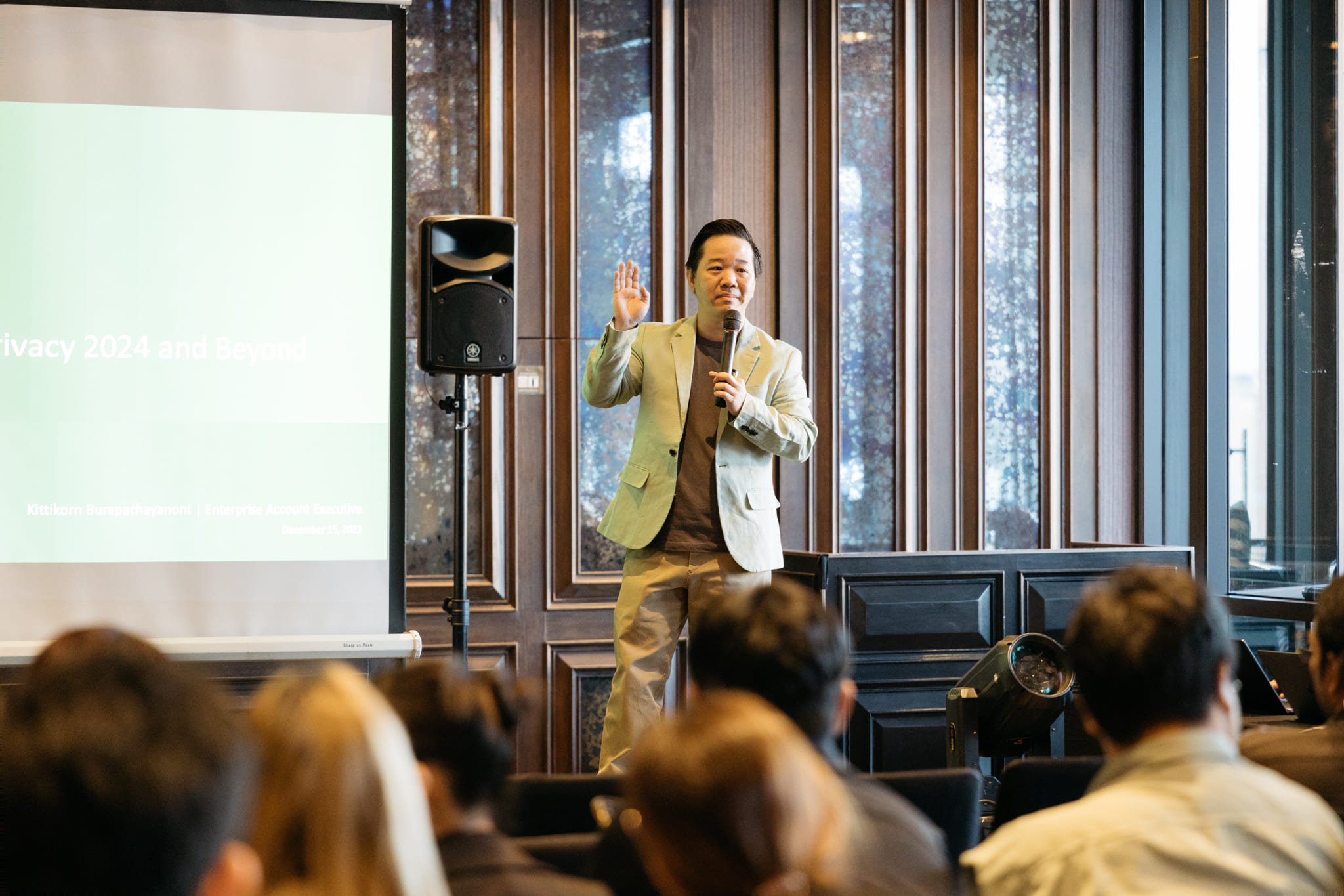 คุณกิตติกร บูรพาชยานนท์ (Account Executive – Enterprise, OneTrust) ที่มาแชร์ความรู้เกี่ยวกับแพลตฟอร์ม Trust Intelligence ในหัวข้อ "OneTrust : The Trust Intelligence Platform from OneTrust brings together GRC and Privacy trend 2024" เทรนด์ความเป็นส่วนตัวปี 2024 ที่สามารถนำไปปรับใช้เข้าด้วยกัน