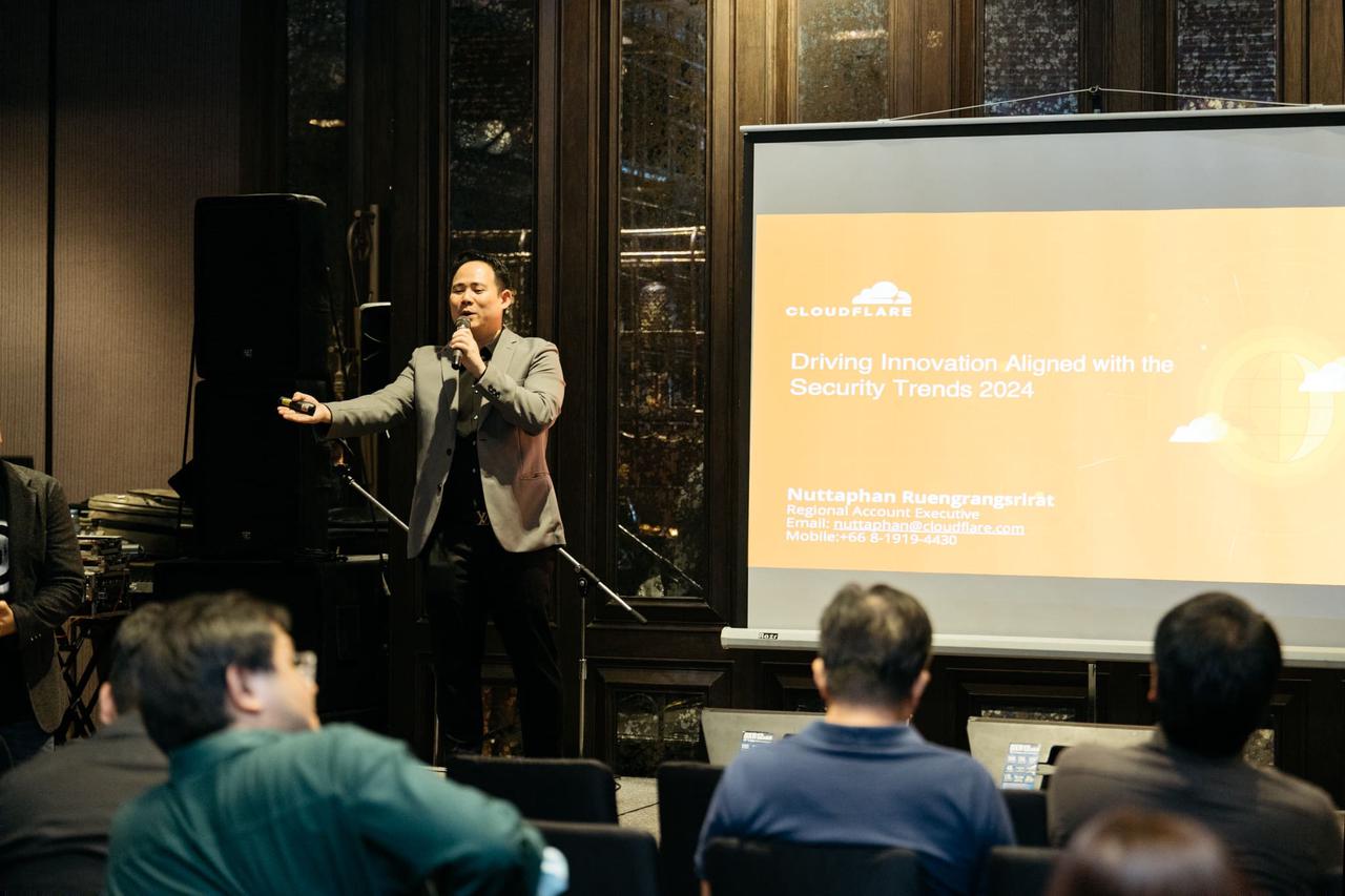 คุณณัฐพันธ์ เรืองรังษีรัตน์ (Regional Account Executive, Cloudflare) ที่มาแบ่งปันความรู้ในหัวข้อ "Cloudflare : Driving Cloudflare Innovation by Aligning with theSecurity Trends 2024" นวัตกรรม Cloudflare ให้สอดคล้องกับแนวโน้มความปลอดภัยปี 2024