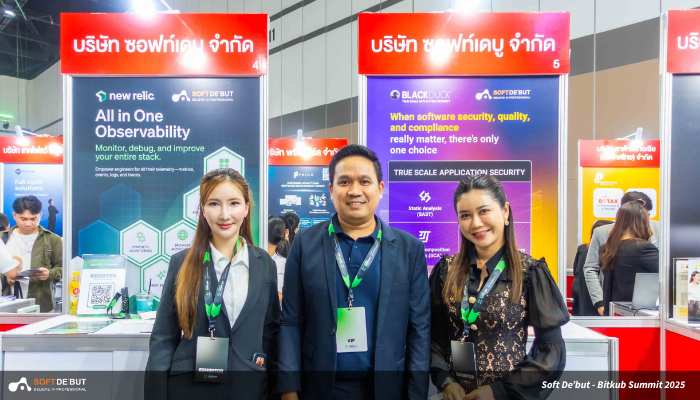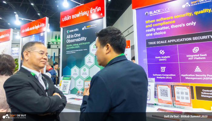 ภายในโซน “Digital Trust Pavilion by FTI” บริษัท Soft De'but ได้ร่วมจัดแสดงนวัตกรรมและโซลูชัน โดยนำเสนอ Observability Platform หรือ Application Performance Monitoring (APM) จาก New Relic ซึ่งเป็นระบบสำหรับติดตาม ตรวจสอบ และวิเคราะห์ประสิทธิภาพของแอปพลิเคชันและโครงสร้างพื้นฐาน IT ทั้งหมดแบบเรียลไทม์ นอกจากนี้ยังได้นำเสนอโซลูชัน Static Code Analysis จาก Black Duck สำหรับการตรวจสอบและวิเคราะห์ความมั่นคงปลอดภัยของซอร์สโค้ดที่พัฒนาและใช้งานภายในองค์กร