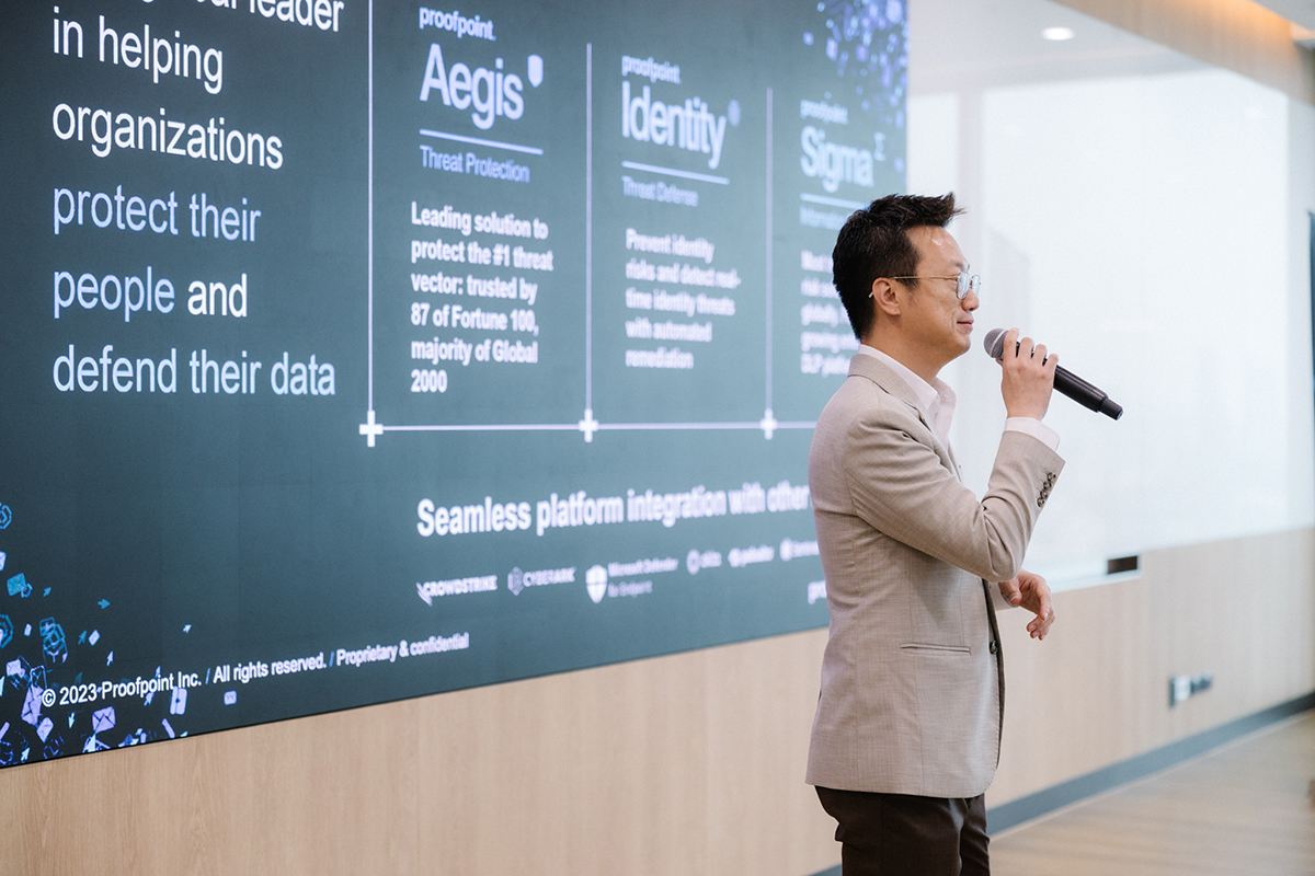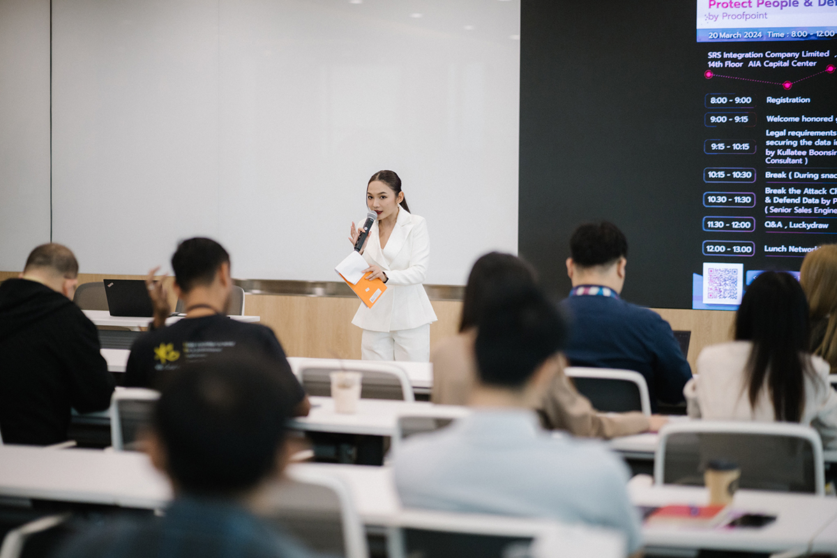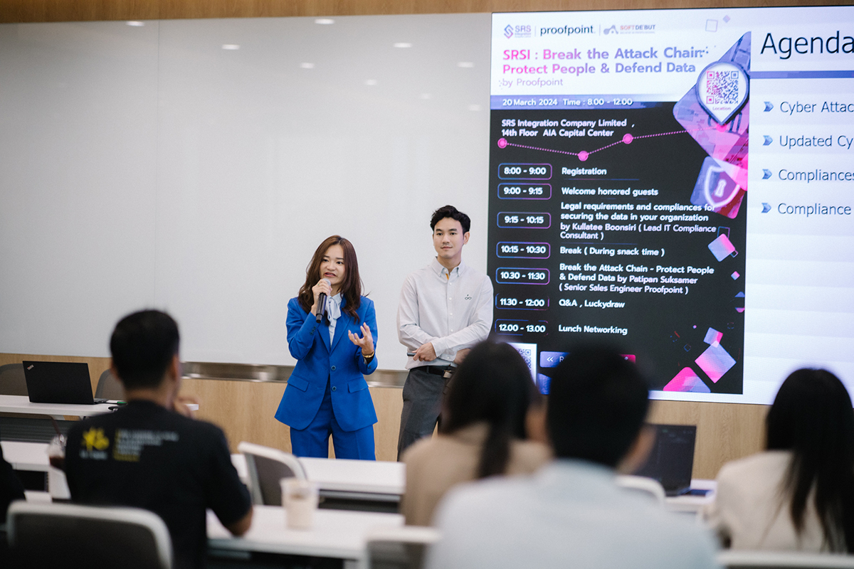 อีกทั้งภายในงาน ได้รับเกียรติจาก คุณปฏิภาณ สุขเสมอ (Senior Sales Engineer, Proofpoint) ผู้ให้บริการด้านความปลอดภัยทางไซเบอร์ ที่มาพูดในหัวข้อ ❝Break The Attack Chain – Protect People & Defend Data❞ ทั้งนี้ Proofpoint ให้บริการโซลูชันเพื่อการป้องกันภัยคุกคามภายในระดับโลกที่ใช้เทคนิคการตรวจจับภัยคุกคามขั้นสูงเพื่อระบุและบล็อกอีเมลที่เป็นอันตรายได้ และสามารถนำมาใช้ในหลายองค์กรต่าง ๆ รวมถึงธุรกิจ หน่วยงานราชการ และสถาบันการศึกษา เพื่อช่วยป้องกันสินทรัพย์ดิจิทัลและข้อมูลที่ละเอียดอ่อนของลูกค้าองค์กรจากการโจมตีทางไซเบอร์ ให้องค์กรทำให้มั่นใจได้ว่าข้อมูลและสิ่งที่สำคัญของลูกค้าจะได้รับการป้องกันอย่างเหมาะสมและทันสมัยที่สุด โดยในงานดังกล่าวมีลูกค้าองค์กรให้ความสนใจเข้าร่วมงานเป็นจำนวนมาก เมื่อวันที่ 20 มีนาคม 2567 ณ บริษัท เอส อาร์ เอส อินทิเกรชั่น จำกัด ที่ผ่านมา